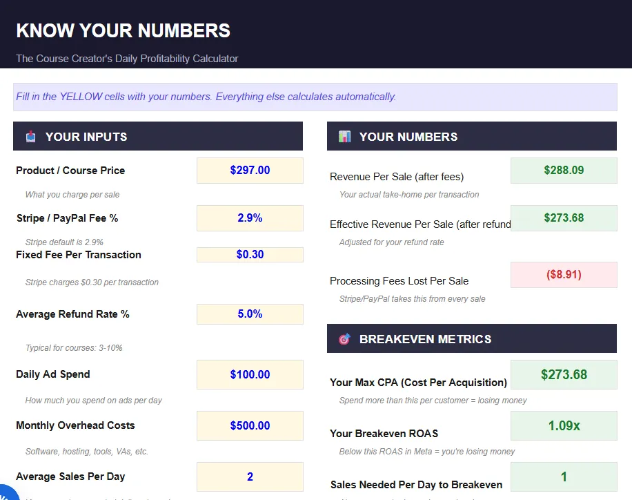 The Know Your Numbers Calculator tells you your real breakeven ROAS, your true max CPA, and your actual daily profit in 60 seconds. No more spreadsheet guessing.