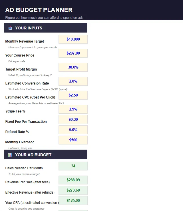 Ad Budget Planner — Work backwards from your revenue goal to find the exact daily budget you can afford — with a warning if the math says your target is unrealistic. ($19 value)