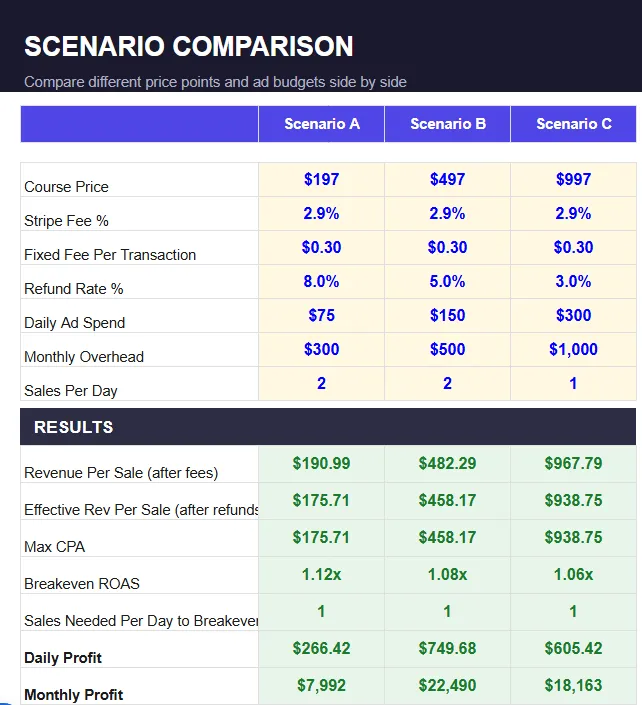Scenario Comparison Tool — Compare 3 price points or ad budgets side by side and see which one actually makes your ads profitable. ($19 value)